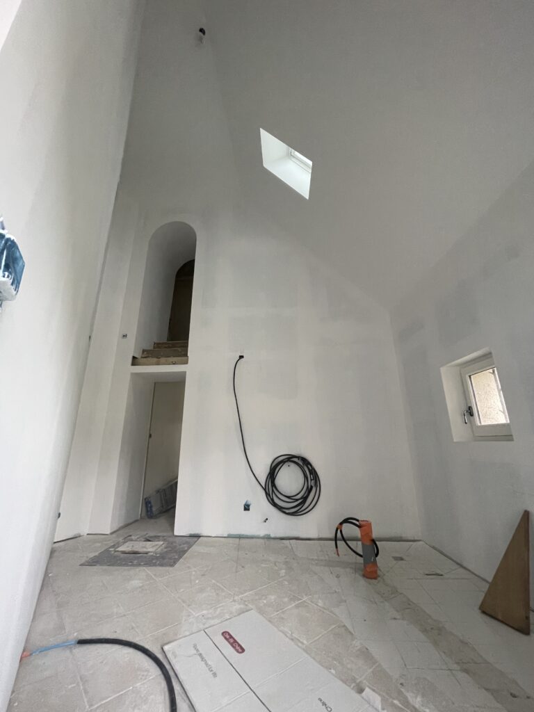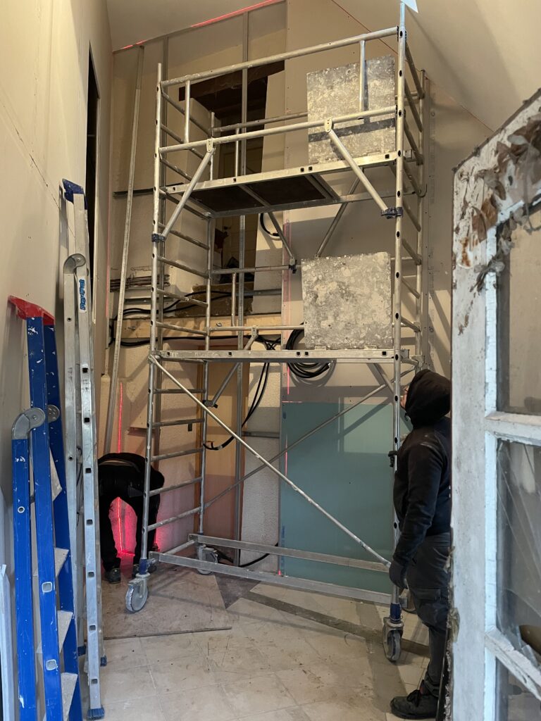 Petit aperçu du travail en cours pour ce vestibule totalement repensé avec le déplacement et le remplacement de l’escalier qui intègrera bientôt WC et rangement au dessous. Un travail d’orfèvre pour ce nouvel escalier fabriqué sur mesure par l’Atelier de Menuiserie / ébénisterie et construction bois « Au Bois Serin » basé à Rilly-sur-Loire.