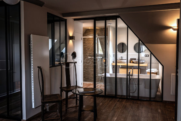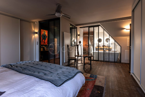 Une verrière a été créée entre la chambre et la salle de bain pour diffuser la lumière naturelle et renforcer la sensation d’espace. Ce nouvel agencement favorise un éclairage transversal entre la fenêtre de toit et celle de la salle de bain, baignant la suite d’une lumière douce.
