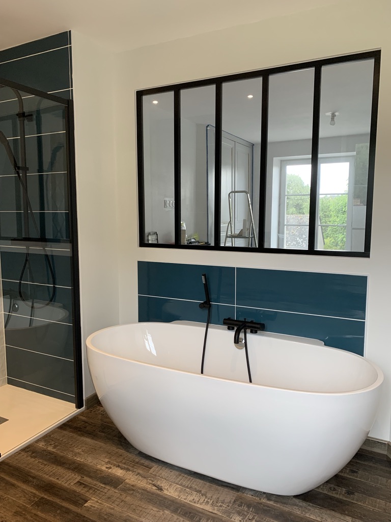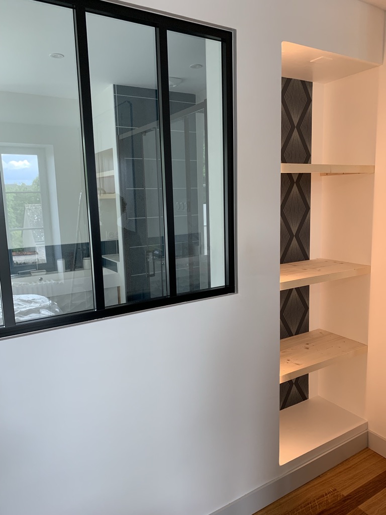 Au-delà du renforcement structurel du plancher, la rénovation a permis de restaurer les parquet bois anciens, une remise en peinture qui apportent une atmosphère apaisante. Le choix de teintes douces, de bois naturel et de finitions noires mates dans la salle de bain crée un équilibre entre modernité et sobriété, pour une suite parentale chaleureuse.