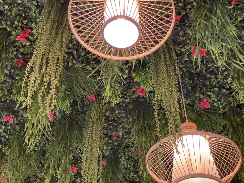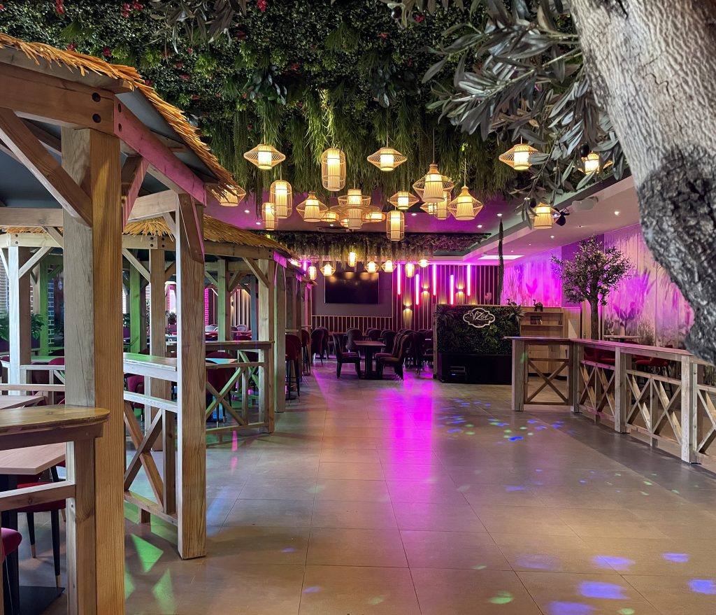 À l’intérieur, ses paillotes aux toits de chaume, ses plafonds végétalisés, ses visuels grand format de mers turquoise ouvrent des fenêtres fictives sur des horizons lointains. Le décor invite à lâcher prise et à l’évasion. Les jeux de lumière jouent un rôle clé : tantôt douces et diffuses pour créer une ambiance feutrée, elles peuvent aussi devenir plus dynamiques grâce à des néons colorés, qui transforment l’espace selon les moments de la soirée. Un décor vivant et modulable, pensé pour surprendre et envoûter.