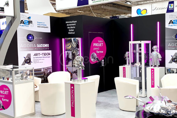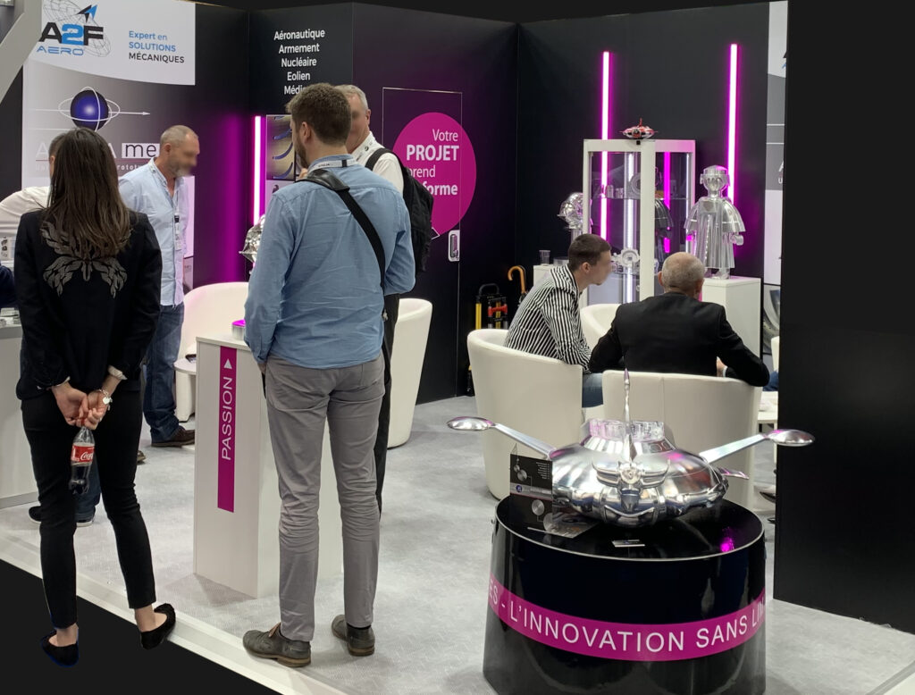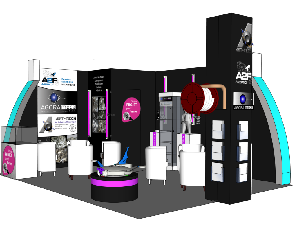 À l’occasion du Salon du Bourget, Sabine Rabin a imaginé ce stand avec pour objectif de rassembler trois entreprises du Centre-Val de Loire (Art-Tech, Agorameca, A2F AERO) partenaires autour d’un même espace. L’enjeu était double : affirmer l’identité de chacune tout en créant une cohérence graphique et design forte.